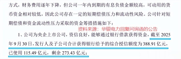 作为大唐集团旗下的上市公司,华银电力融资具有一定优势。截至2025年前三季度末,其拥有的银行综合授信额度高达388.91亿元,成为公司应对短期流动性紧张的安全垫。
