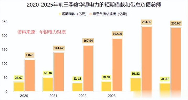 更扎眼的是债务结构,2025年前三季度末,华银电力总负债260.1亿元,里面有236.93亿元都是作为带息债务压在账上,是其手头货币资金的近22倍!