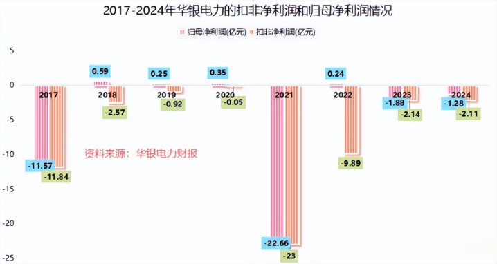 从账面看,过去2017年到2024年间,华银电力的扣非净利润连续8年都是负数,加起来,期间的亏损额超过52个亿。