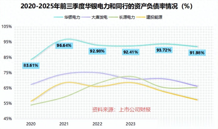 自2021年至今,华银电力的资产负债率再没下过90%,比大唐发电、长源电力和建投能源等同行能高出近30个百分点!