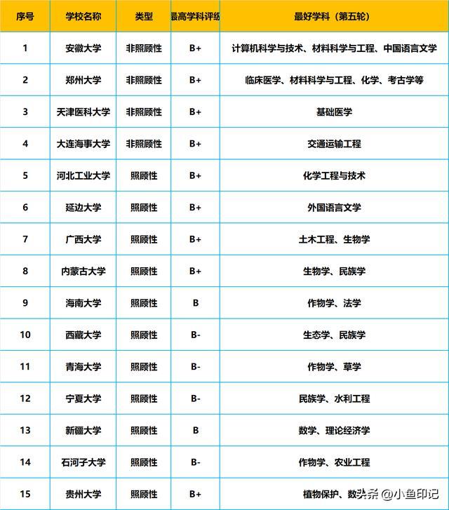 照顾性的211高校里面,包括广西大学的土木工程、内蒙古大学的生物学、宁夏大学的化学工程与技术、西藏大学的生态学、新疆大学的化学和计算机科学技术都是被警示。